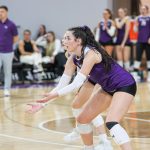 - Aubrey Beaver, junior outside hitter from Murrieta, California, prepares for a dig. (Photo by Callie Brimberry)
