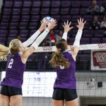 - The Wildcats jump to block the ball at the net. (Photo by Callie Brimberry)
