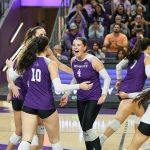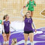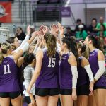 - Rachel Koss, junior setter from Appleton, Wisconsin, celebrates with her teammates after scoring a point. (Photo by Callie Brimberry)