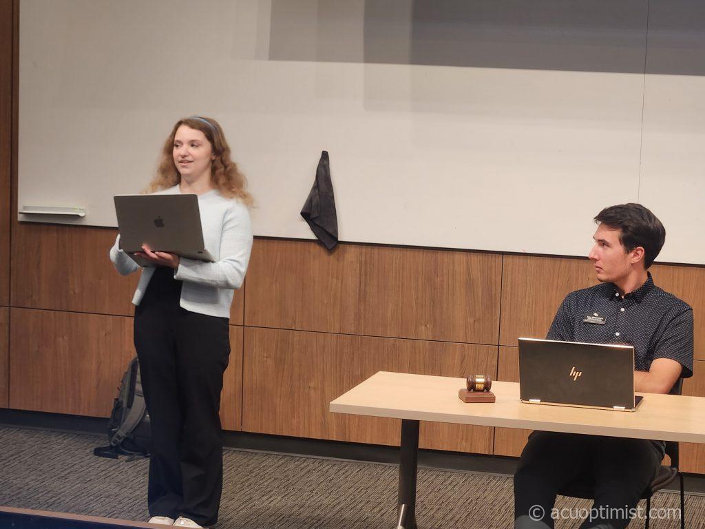 Danielle Galon, sophomore biochemistry major from Abilene, presenting legislation requesting hot water to be fixed in Halbert-Walling Research Center. (Photo by Makayla Clayton)