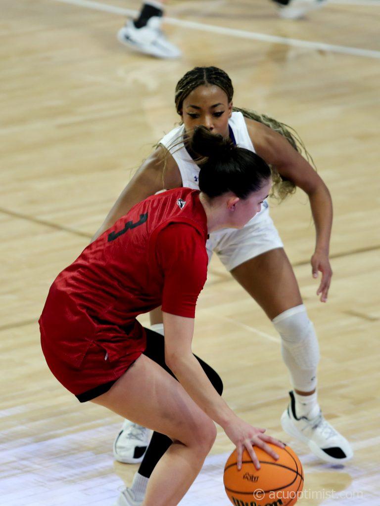 Breanna Davis, senior guard from Waxahachie, plays defense against Southern Utah. (Photo by Daniel Rhodes)