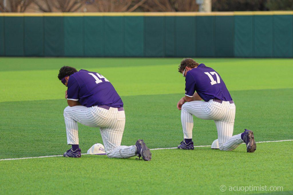 March 5, 2026 by Callie Brimberry Leave a Comment Diego Cardenas, senior infielder from El Paso, and Thomas Schnabel, freshman outfielder from Driftwood, kneel to pray before the game. (Photo by Callie Brimberry).