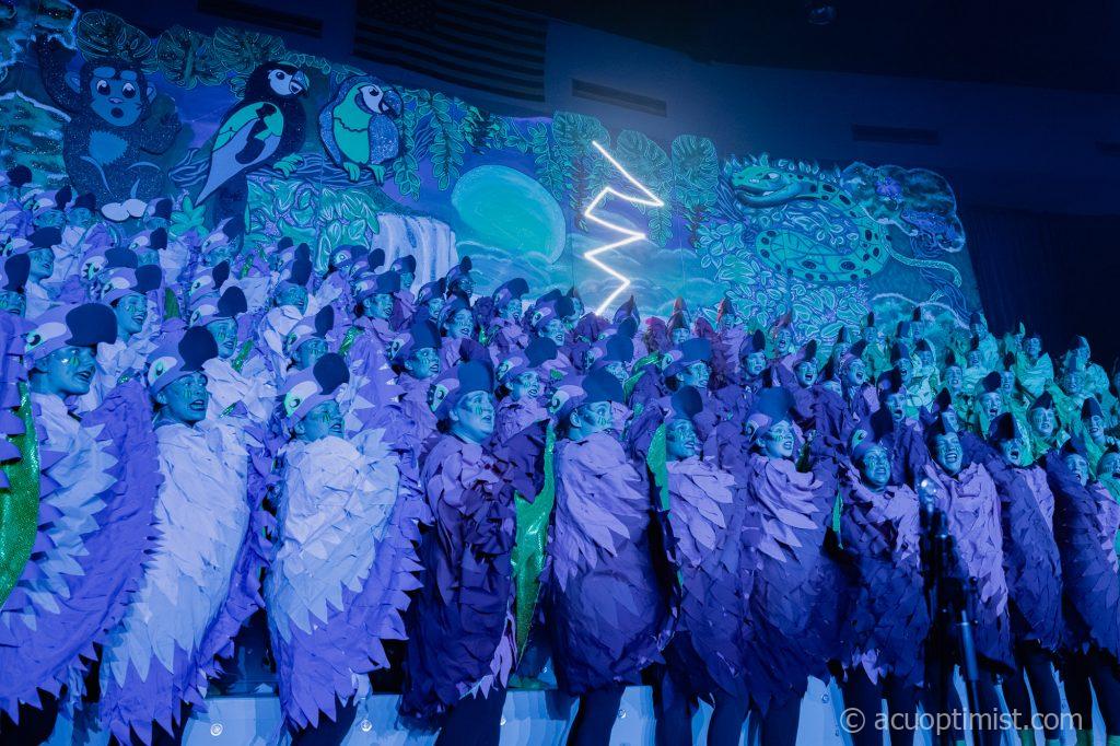 Lightning strikes in the rainforest set during Ko Jo Kai’s parrot-themed act at Sing Song 2026. (Photo by Daniel Curd)