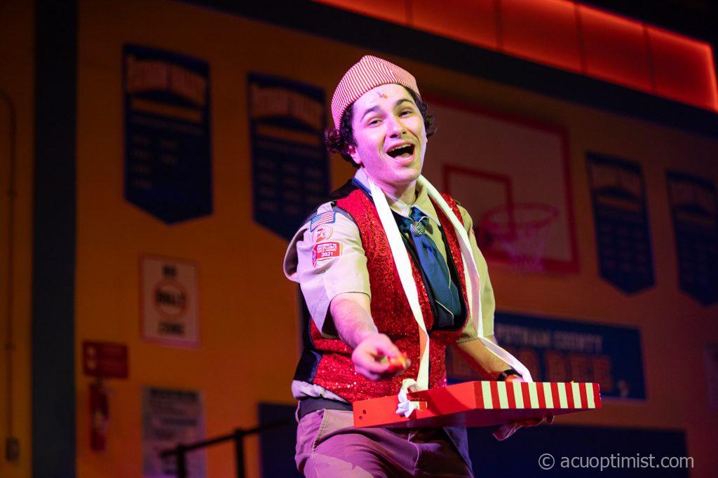 April 22, 2026 by Callie Brimberry Leave a Comment Chip Tolentino, played by senior theatre major CJ Rosado, throws candy at the audience. (Photo by Callie Brimberry)