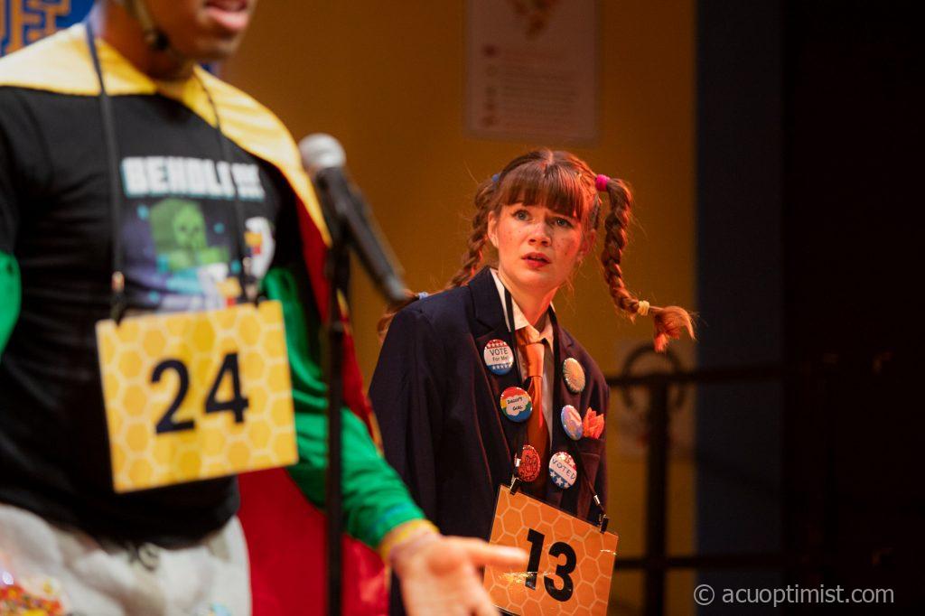 April 22, 2026 by Callie Brimberry Leave a Comment Logainne Schwartzandgrubenierre, played by senior theatre major Kinley Schollenbarger, looks puzzled at her peer. (Photo by Callie Brimberry)