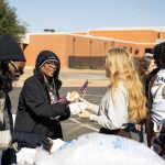 - A member of the Abilene community hands out a doughnut to a participant in the MLK Day march. (Photo by Callie Brimberry)