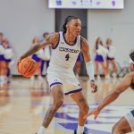- Zy Wright, senior guard from Lincolnton, Georgia, looks to pass as he dribbles around CBU’s Martel Williams. (Photo by Naya Pacheco)