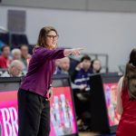 - Head coach Julie Goodenough directs a player from the sideline. (Photo by Daniel Curd)
