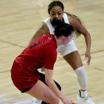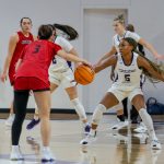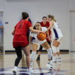 - Natalia Chavez, senior guard from Cochiti Pueblo, New Mexico, looks for an opening. (Photo by Daniel Rhodes)