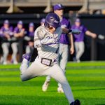 - JT Thompson, senior infielder from Abilene, sprints to first base. (Photo by Daniel Curd)