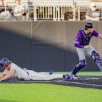 - Brady Ladusau, freshman outfielder from Heath, rests his hand on second base after sliding. (Photo by Daniel Curd)