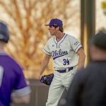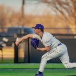 - Carson Wallace, freshman left-handed pitcher from Harleton, delivers a pitch. (Photo by Daniel Curd)