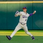 - Reese Borho, junior outfielder from Abilene, throws the ball back to his teammates. (Photo by Daniel Curd)
