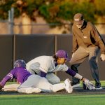 - Nick Arias, senior infielder from Tucson, Arizona, reaches for the ball as St. Thomas’ Eddie Novoa slides into third base. (Photo by Daniel Curd)