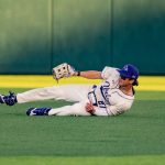 - Braden Regala, sophomore outfielder from Abilene, slides on the ground after making a catch. (Photo by Daniel Curd)