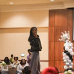 - Anaia Mosley, senior communication disorders major from Crowley, welcomes students to the Hair and Fashion Pageant Show. (Photo by Callie Brimberry)