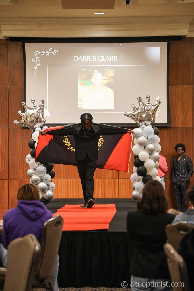 February 23, 2026 by Callie Brimberry Leave a Comment Darius Clark, junior information systems major from Grand Prairie, walks down the runway holding the Black American Heritage flag. (Photo by Callie Brimberry)