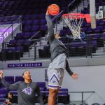 - Bradyn Hubbard, senior forward from Tulsa, Oklahoma, dunks during warmups. (Photo by Daniel Rhodes)