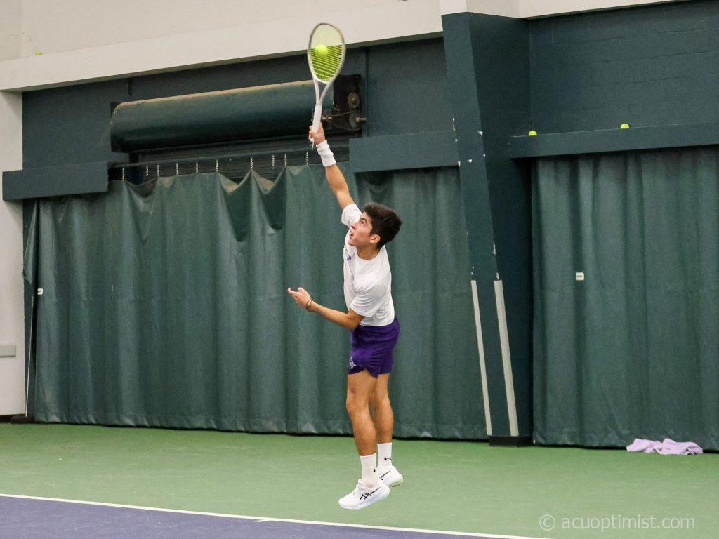 Luis Jose Nakamine, sophomore from Trujillo, Peru, jumps to return a serve to a Trinity player. (Photo by Daniel Rhodes)