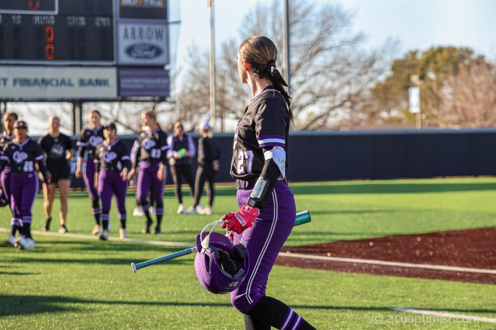 - Audrey Lacina, redshirt sophomore utility from Bentonville, Arkansas, walks to the dugout holding her gear. (Photo by Callie Brimberry)