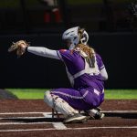 - Valerie Ornelas, redshirt senior catcher from Madera, California, frames a strike. (Photo by Naya Pacheco)