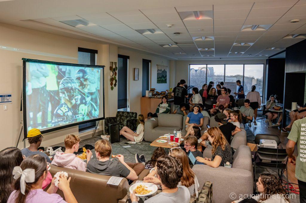 Residents of Mabee Hall watch the Super Bowl. (Photo by Daniel Curd)