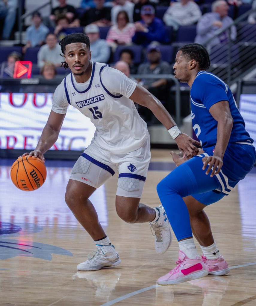 Bradyn Hubbard, senior forward from Tulsa, Oklahoma, dribbles up the court. (Photo by Daniel Curd)