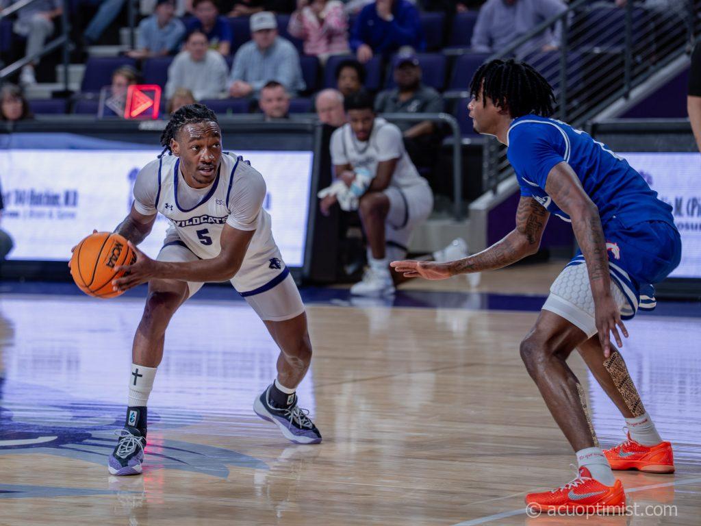 Cbo Newton, redshirt sophomore guard from Ruston, Louisiana, looks for an opening past his defender. (Photo by Daniel Curd)