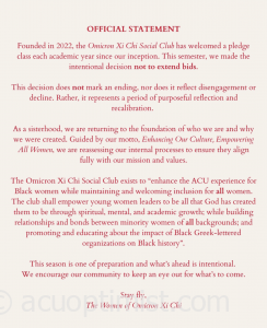Omicron Xi Chi posted an official statement on its Instagram to explain their decision to not extend any bids in the spring semester. It was posted on Feb. 5, 2026.