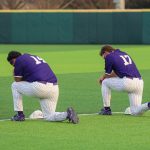 - Diego Cardenas, senior infielder from El Paso, and Thomas Schnabel, freshman outfielder from Driftwood, kneel to pray before the game. (Photo by Callie Brimberry).