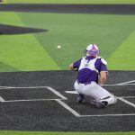 - Gavin Brzozowski, graduate outfielder/left-handed pitcher from Mansfield, talks with a teammate across the field. (Photo by Callie Brimberry).