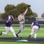 - Diego Cardenas, senior infielder from El Paso, nearly makes it to first base before getting an out. (Photo by Callie Brimberry)