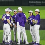 - Head coach Rick McCarty meets with the team on the pitcher’s mound. (Photo by Daniel Rhodes).