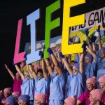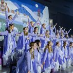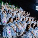 - Members of the Freshman White act hold up a sign spelling “Life” during their act at Sing Song 2026. (Photo by Naya Pacheco)