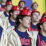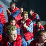 - The men of Galaxy hold up candles during their “Moonies on Fire” act at Sing Song 2026. (Photo by Daniel Curd)