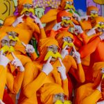 - Members of Freshman Purple dress as robbers during their heist-themed act at Sing Song 2026. (Photo by Naya Pacheco)
