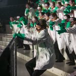 - Angie Wagle, senior biochemistry major from Plano, pretends to come alive during the Senior act’s mad scientist-themed performance at Sing Song 2026. (Photo by Daniel Curd)