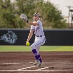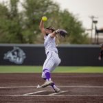 - Leah Meyer, junior pitcher from Ocala Florida, in her windup during her pitch. (Photo by Naya Pacheco)