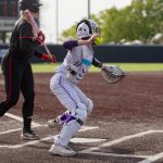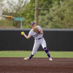 - Audrey Lacina, redshirt sophomore from Bentoville Arkansas, throws down to second in attempt for an out. (Photo by Naya Pacheco)