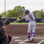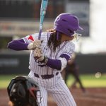 - Ari Maxwell, sophomore outfielder from Edmond Oklahoma, in her second at bat of the game. (Photo by Naya Pacheco)