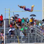 - Canaan Fairley, redshirt junior multisport athlete from San Antonio, clears the bar in the pole vault at Elmer Gray Stadium. (Photo by Callie Brimberry)