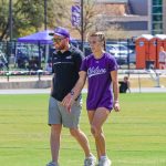 - Emma Santoro, sophomore middle distance runner from Rockwall, walks alongside assistant coach Nathan Meeuwenberg at Elmer Gray Stadium. (Photo by Callie Brimberry)