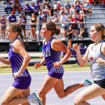 - Anna Vyn, freshman middle-distance runner from Sioux Falls, South Dakota, and Emma Santoro, sophomore middle-distance runner from Rockwall, race in the women’s 800 meters. (Photo by Callie Brimberry)