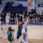 - Payton Hull, junior guard from Peaster, shoots while Utah Valley defenders attempt to block her shot. (Photo by Daniel Curd)