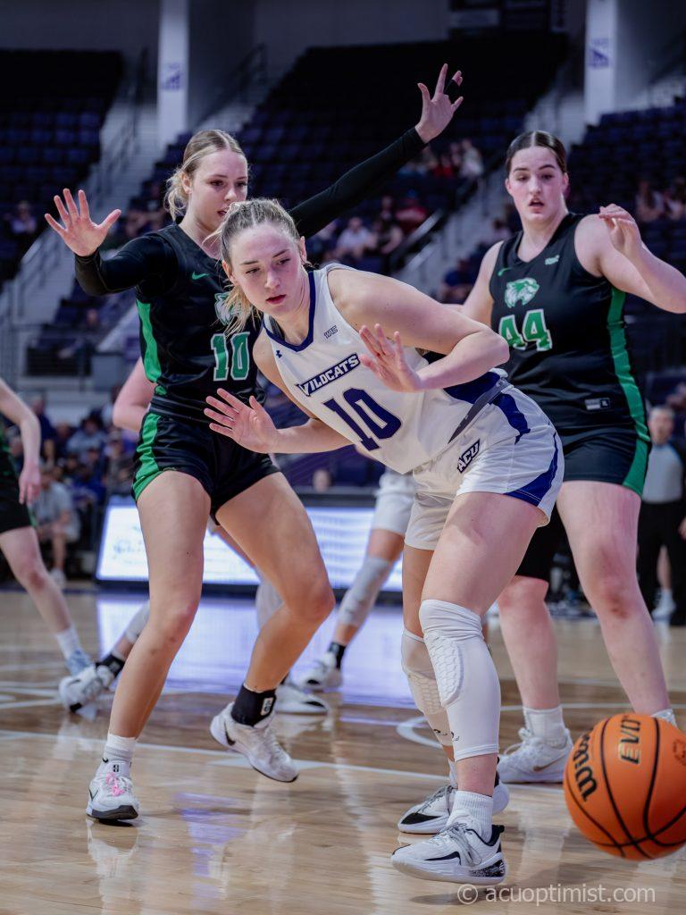 Payton Hull, junior guard from Peaster, signals she does not have possession of the ball as it goes out of bounds. (Photo by Daniel Curd)