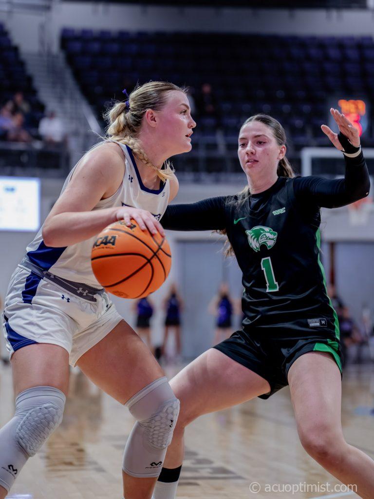 Emma Troxell, junior forward from Bushland, dribbles the ball while looking for an opening past Utah Valley's Kylee Mabry. (Photo by Daniel Curd)