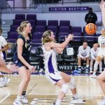 - Emma Troxell, junior forward from Bushland, passes the ball to a teammate at Moody Coliseum. (Photo by Callie Brimberry)