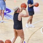 - Luke Moffitt, junior finance major from Seagoville, shoots a basketball during a halftime competition. (Photo by Callie Brimberry)