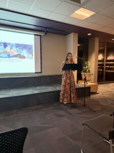 Moore said he had his students visit the exhibition in January and respond through poetry. On Feb. 19, the students showcased their poems in the Brown Library reading commons area. As the student poets spoke, the art flashed on a screen behind them, allowing the audience to visualize the artistic conversation.
