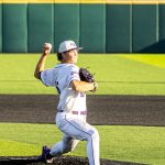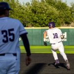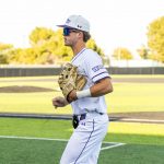 - Nick Arias, senior infielder from Tucson, Arizona, warms up by throwing the ball to the second baseman. (Photo by Callie Brimberry)
